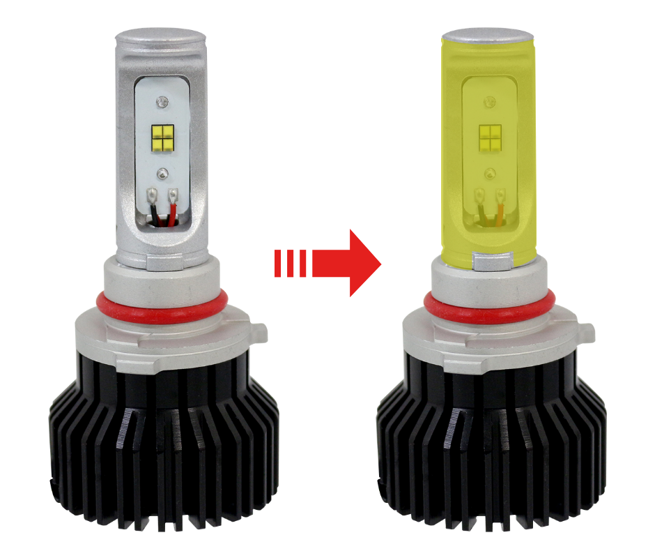新LEDを採用し、片側4素子(計8素子)2500lm(※ホワイト:左右合計値)で、従来タイプより幅広い照射角でより見やすく白い配光を可能としました。 さらに従来製品と比べバルブ後方のボディ部を約8ミリかくする事により、軽自動車などの後方スペースの狭い車両など、幅広い車種にご利用いただけるようになりました。 もちろん従来とおり、付属のアタッチメントを装着するだけで、イエロー光に変更可能。用途に応じホワイト/イエローの2色の選択が可能です。