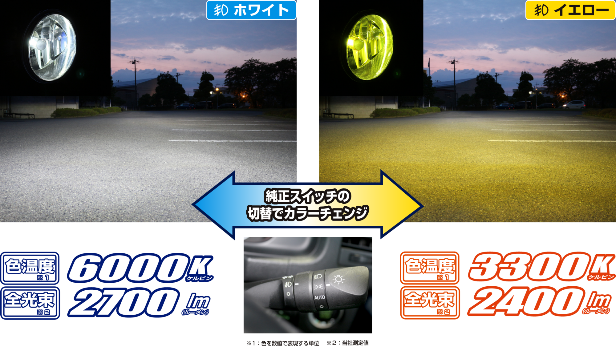 運転席の純正フォグランプスイッチを1回OFF→ON操作することで、発光色をホワイト/イエローを用途に応じカラーチョイスすることができます。