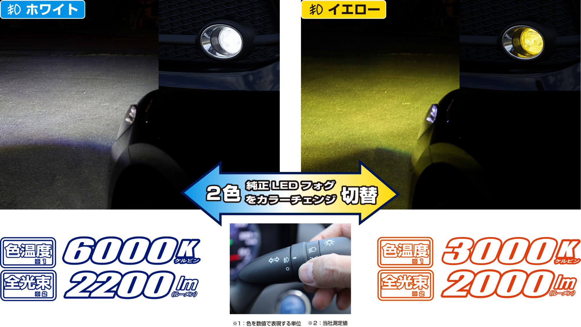 この2つの理想を1本のバルブで実現し、純正フォグランプスイッチで発光色を切り替え可能。