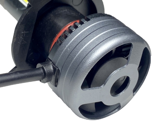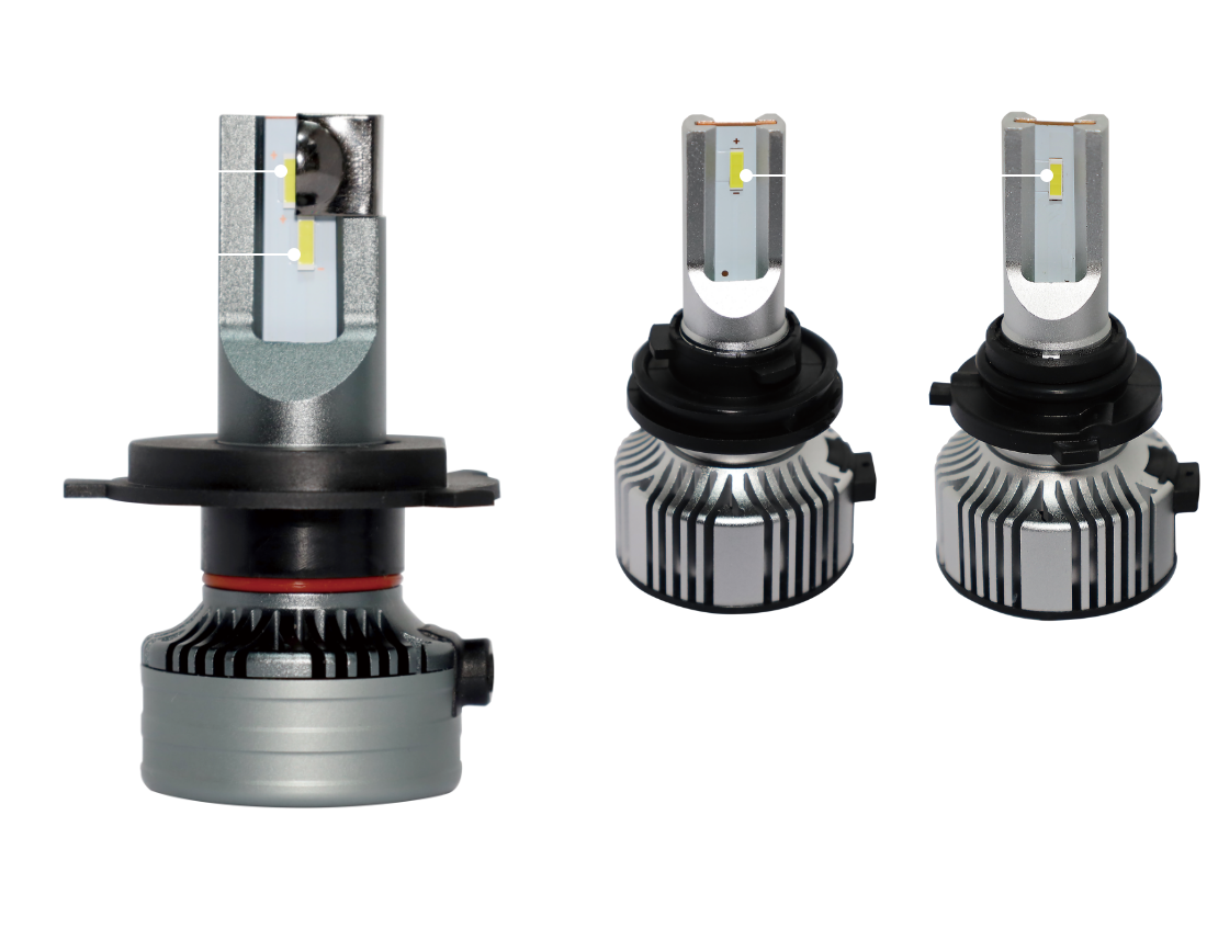 LEDの実装基盤に放熱効率の良い厚さ1.5mmの銅基盤へハロゲンバルブのフィラメントと同等の形状の大光量LEDチップを実装することで、ハロゲンバルブ用に設計された灯体に装着した際も、本来の配光を乱すことなく正確なムラのない照射を実現しました。