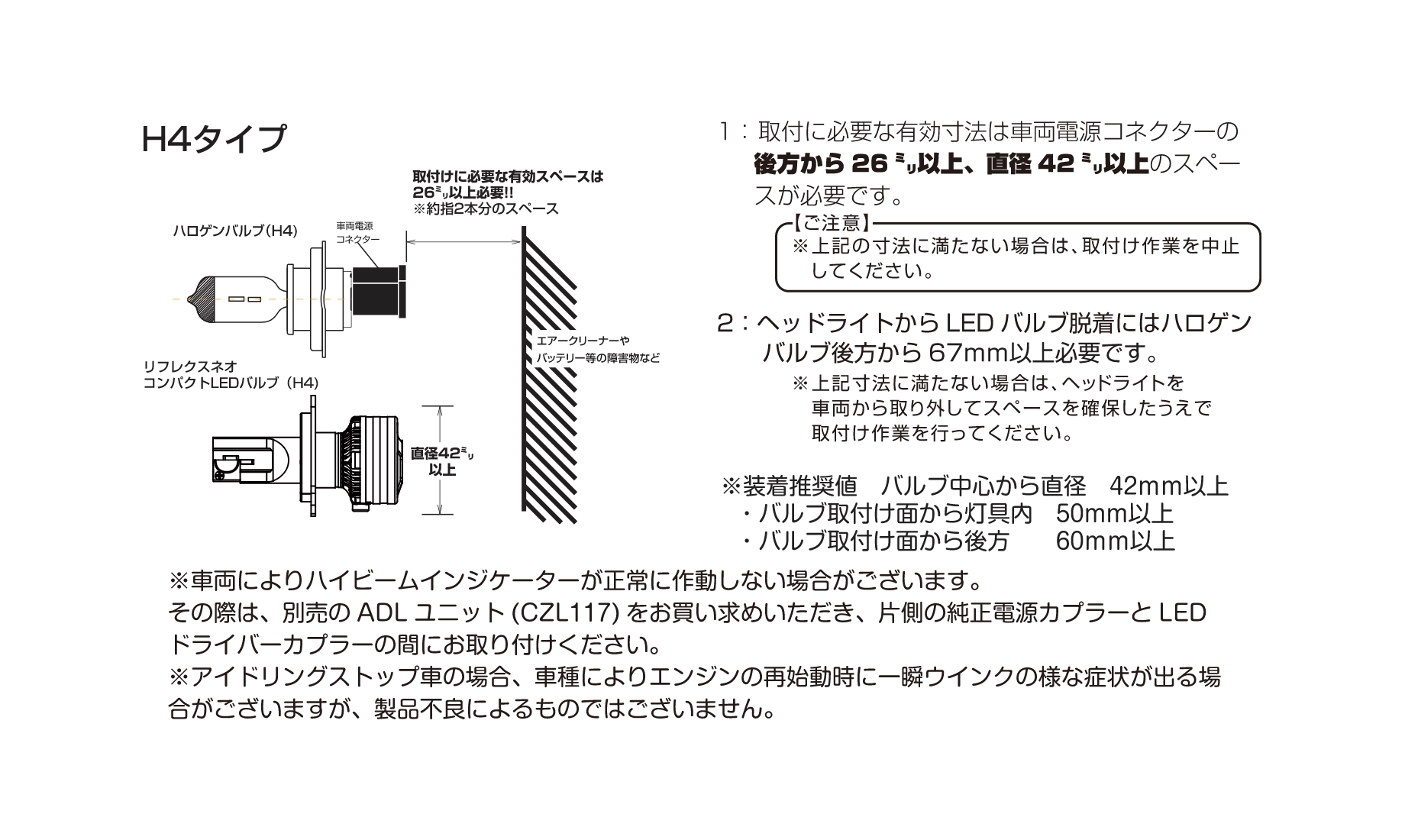 ※車両によりハイビームインジケーターが正常に作動しない場合がございます。その際は、別売のADLユニットⅡをお買い求めいただき、片側の純正電源カプラーとLEDドライバーカプラーの間にお取り付けください。