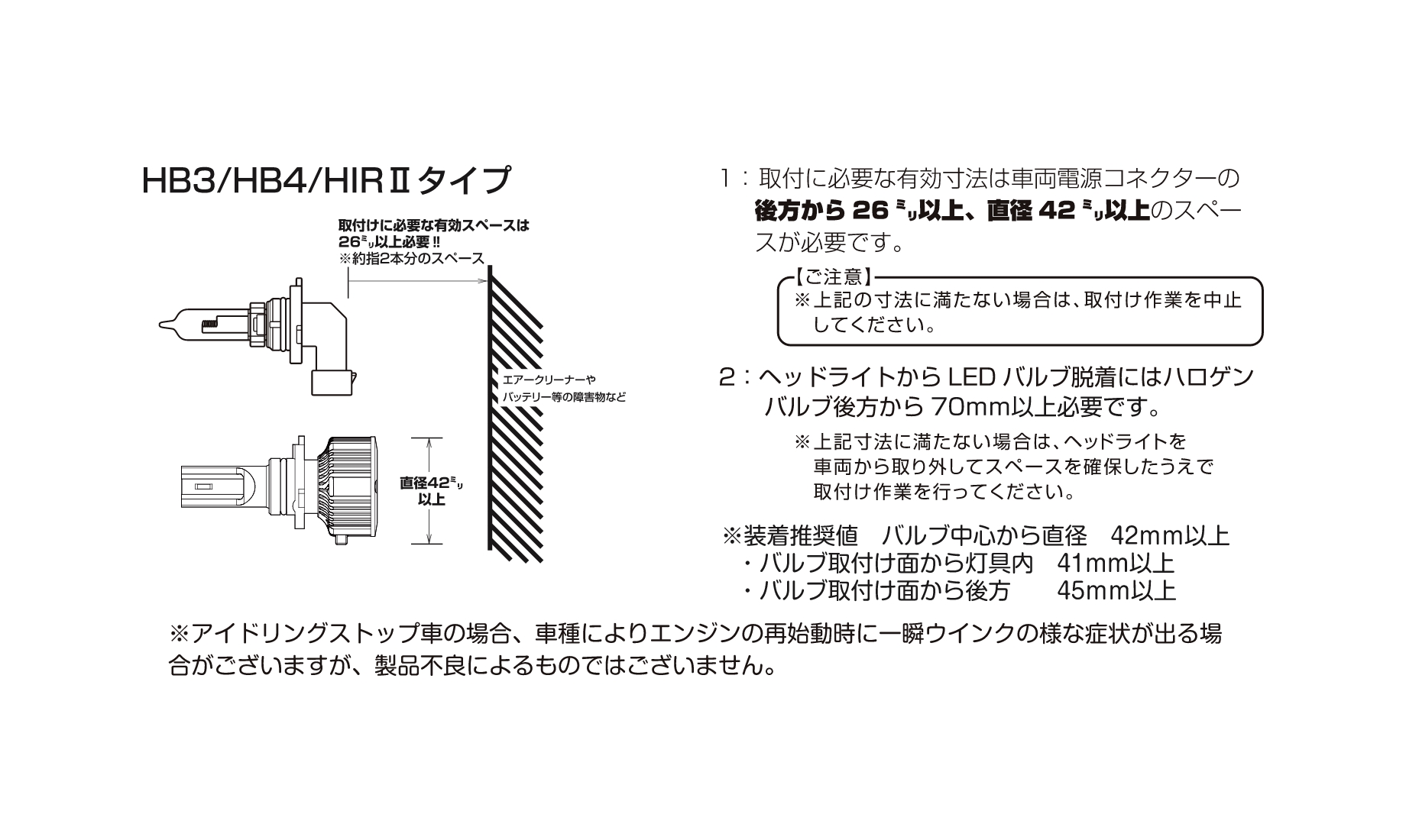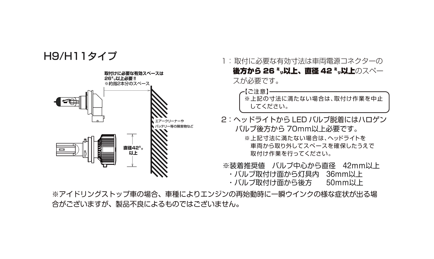 ※アイドリングストップ車の場合、車種によりエンジンの再始動時に一瞬ウインクの様な症状が出る場合がございますが、製品不良によるものではございません。