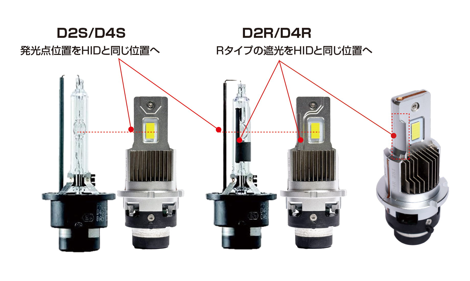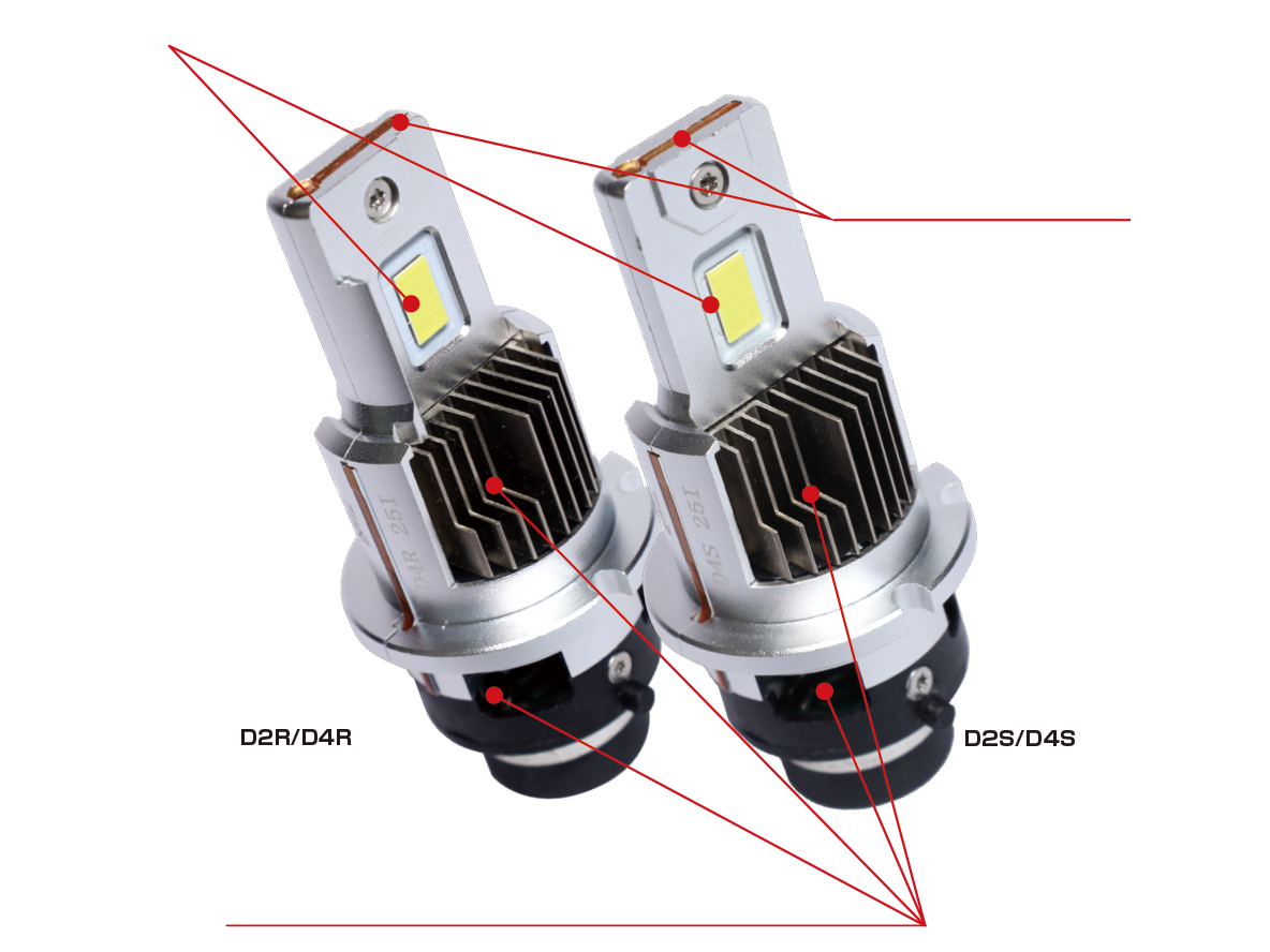 LEDの実装基盤に放熱効率の良い薄型銅基盤へ純正HIDバルブの発光部と同等の形状の大光量LEDチップを実装することで、純正HIDバルブ用に設計された灯体に装着した際も、本来の配光を乱すことなく正確なムラのない照射を実現しました。