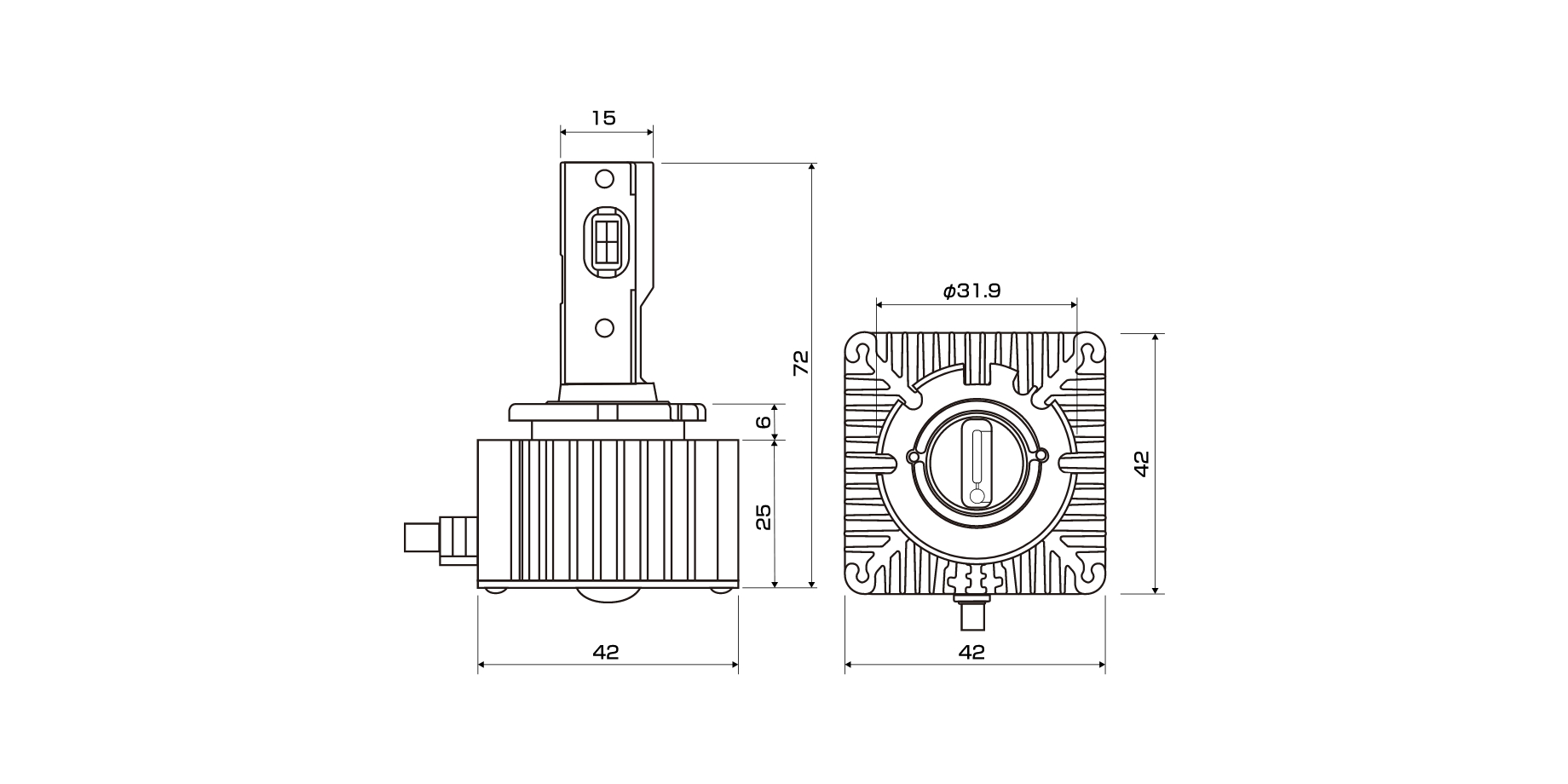 LEDの実装基盤に放熱効率の良い厚さ1mmの銅基盤へHIDバルブの発光部と同位置に大光量LEDチップを実装することで、HIDバルブ用に設計された灯体に装着した際も 、本来の配光を乱すことなく正確なムラのない照射を実現しました。