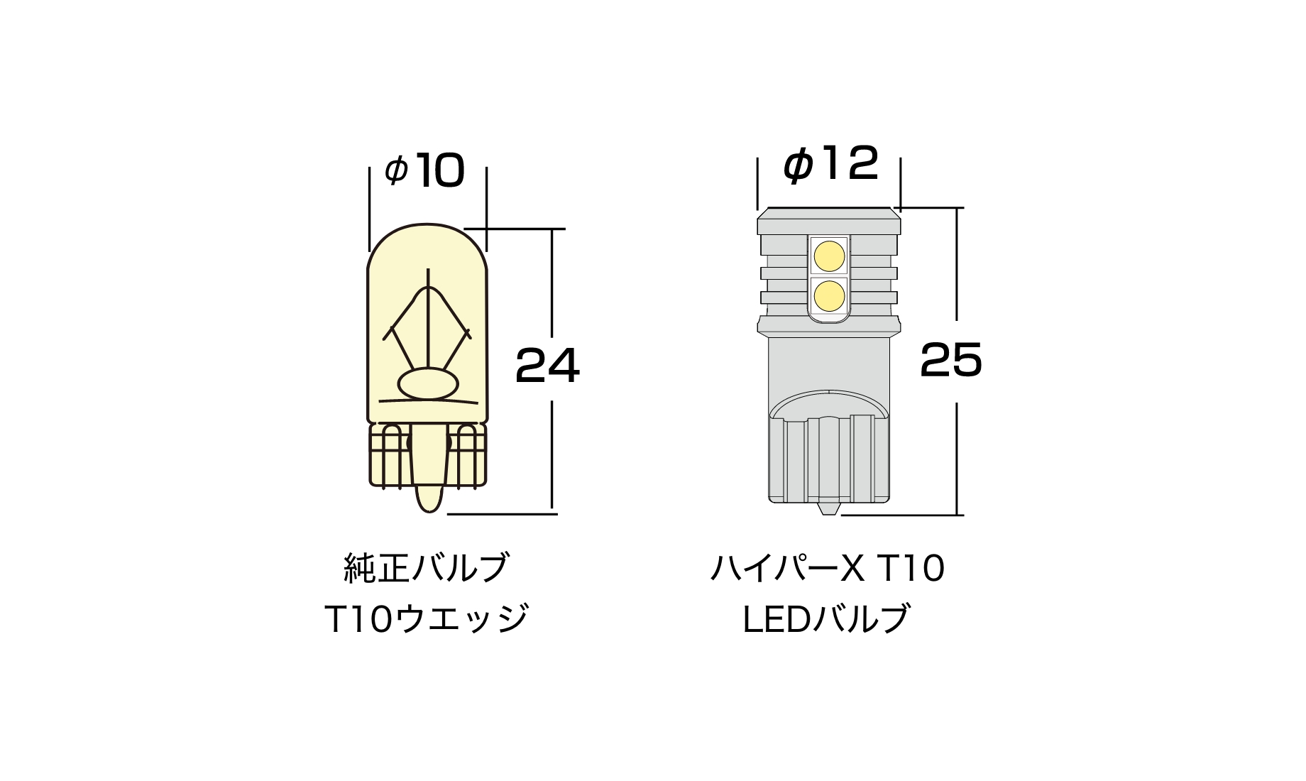 バルブ寸法を純正T10ウエッジと同サイズにする事で、ポジション(スモール)・ルーム ・マップ・カーテシ(ドア)・トランクルーム・ナンバー灯など多くの場所への装着が可能!