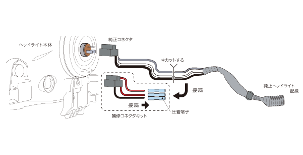 バルブのトラブルやHID装着時等にバルブコネクタを破損した際に対応する補修コネクター。破損したバルブコネクタの配線を切断後補修コネクターへ付替えます。配線の接続を行うための圧着端子も付属。万一の際に、安心してご使用いただけるよう、純正のクオリティを上回る耐久性・耐熱性を備えたコネクターです。