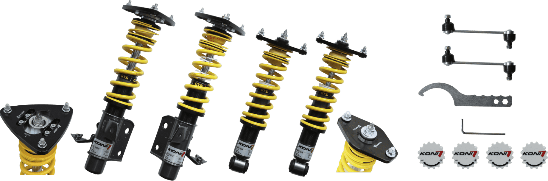 KONI GTSコイルオーバーサスペンションキットは、世界最高クラスのKONI Sportアジャスタブルバルブ、リニアローダウンスプリング、車高調整式パーチ、そしてネジ式ボディを組み合わせ、お車にすぐに取り付け可能なフルキットです。