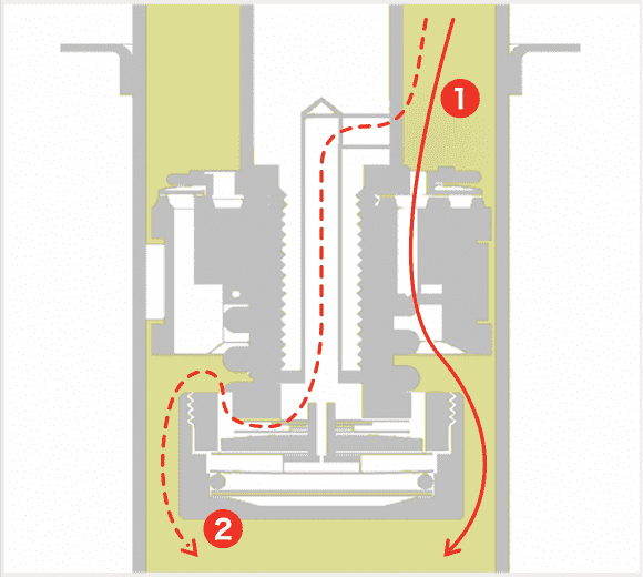 ピストンスピードやストロークの変化に応じて、ルート❶と❷を通過するオイル量を自動的にコントロールし、減衰力を調整します。