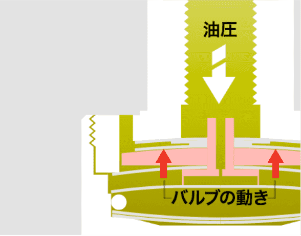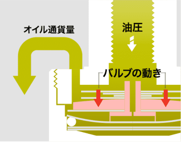 バルブの中央をオイルが通過することによりオイル室内の油圧が変化し、バルブを上下に移動させる。