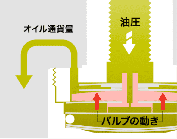 →小さな油圧が生じ、バルブが押し下げられる→オイル通過量が増える