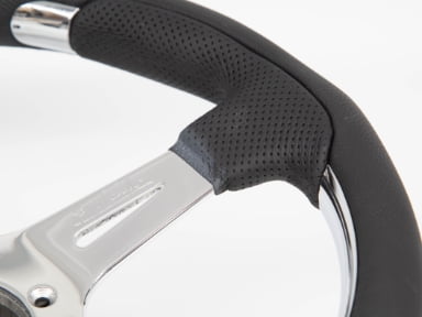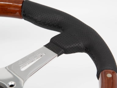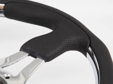 センタースポークを2分割した大胆且つ美しいスポーク形状。スポークはポリッシュ仕上げ。グリップ部の素材をレザー/パンチングレザーコンビネーションとし、グリップ感と適度なすべりを両立しつつ、グリップ部内側にポリッシュ加工を施しシンプル且つ高級感を演出しています。
