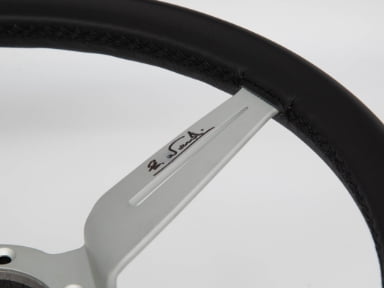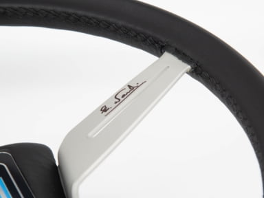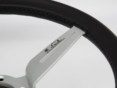 ホーンボタンとシルバーホーンリングのスタンダードなデザインにスポークを2分割した大胆且つ美しいスポーク形状。スポークはホワイトアルマイト仕上げ。グリップ部の素材スムースレザーとし、グリップ下部に『90th anniversary 』のレーザー彫刻を施しシンプル且つ高級感を演出しています。