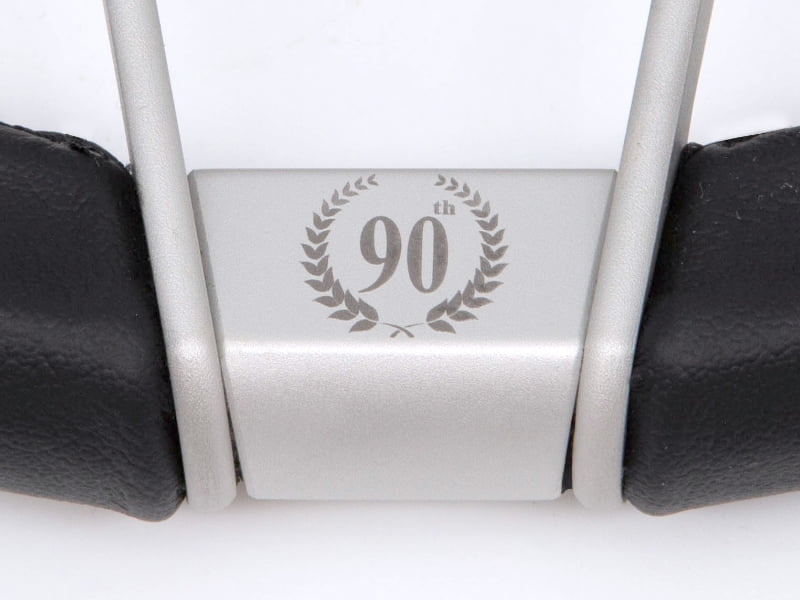 レザーセンターパッドにスポークを2分割した大胆且つ美しいスポーク形状。スポークはホワイトアルマイト仕上げ。グリップ部の素材スムースレザーとし、グリップ下部に『90th anniversary 』のレーザー彫刻を施しシンプル且つ高級感を演出しています。