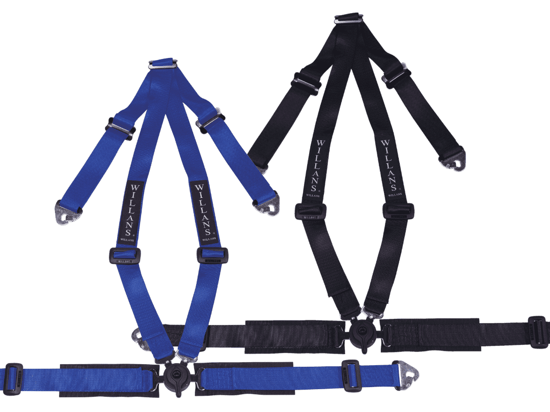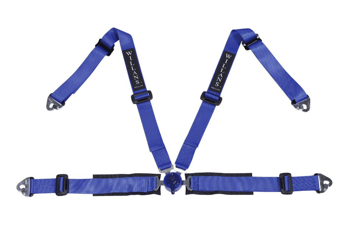 ストラップは、3インチと2インチ幅のものがあり、3インチはFIA公認のモデルです。2インチモデルは腰ストラップに3インチ幅の荷重分散パッドを採用し、ホールド性を高めています。バックルには、ストラップを個別に固定・ワンアクションで解除できるロータリーバックルを採用しているため、万が一の脱出性が高く、車両への乗降がスムーズです。しかも、WILLANSのロータリーバックルはレバーを左右どちらに回しても4本のストラップを瞬時に解除することができ、緊急時の大きなアドバンテージとなります。別売りのクラッチストラップを追加する事で5点式、6点式への変更が可能です。